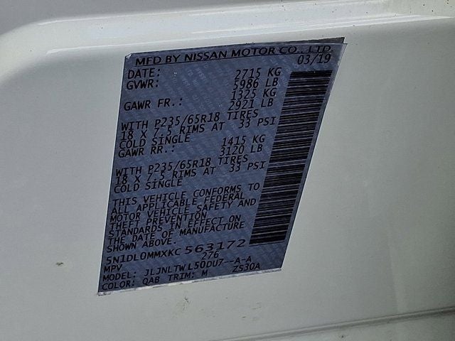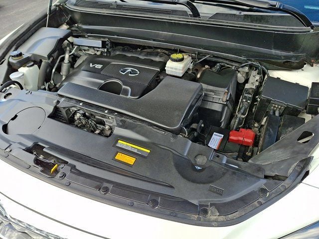 Below is all the standard equipment Cargo Package Essential (Cargo Protector, Console Net, First Aid Kit, and Rear Cargo Cover), Essential Package (Around View Monitor w/Moving Object Detection, Front & Rear Sonar System (2FR/2RR), Illuminated Kick Plates (IKP), INFINITI InTouch w/Navigation & InTouch Services, Leather-Appointed Seat Trim, Rain-Sensing Front Windshield Wipers, and Voice Recognition for Navigation Functions), Navigation System, Wheels: 18 Triple 5-Spoke Aluminum-Alloy, 13 Speakers, 3rd row seats: bench, 4-Wheel Disc Brakes, 5.25 Axle Ratio, ABS brakes, Air Conditioning, Alloy wheels, AM/FM radio: SiriusXM, Anti-whiplash front head restraints, Auto-dimming Rear-View mirror, Automatic temperature control, Bodyside moldings, Brake assist, Bumpers: body-color, Carpeted Floor Mats (4-Piece Set), CD player, Delay-off headlights, Driver door bin, Driver vanity mirror, Dual front impact airbags, Dual front side impact airbags, Electronic Stability Control, Four wheel independent suspension, Front anti-roll bar, Front Bucket Seats, Front Center Armrest w/Storage, Front dual zone A/C, Front fog lights, Front reading lights, Fully automatic headlights, Garage door transmitter: HomeLink, Heated door mirrors, Heated Front Seats, Heated front seats, Heated steering wheel, Illuminated entry, Illuminated Kick Plates (K11), Leather steering wheel, Leatherette Seat Trim, Literature Kit, Low tire pressure warning, Memory seat, Occupant sensing airbag, Outside temperature display, Overhead airbag, Overhead console, Panic alarm, Passenger door bin, Passenger vanity mirror, Power door mirrors, Power driver seat, Power Liftgate, Power moonroof, Power passenger seat, Power steering, Power windows, Radio data system, Radio: AM/FM/CD/DVD w/Bose Premium Audio System, Rear air conditioning, Rear anti-roll bar, Rear Bumper Protector, Rear reading lights, Rear seat center armrest, Rear window defroster, Rear window wiper, Reclining 3rd row seat, Remote keyless entry, Roof rack: rails only, Security system, Speed control, Speed-sensing steering, Speed-Sensitive Wipers, Splash Guards (Color Matched, Set of 4), Split folding rear seat, Spoiler, Steering wheel memory, Steering wheel mounted audio controls, Tachometer, Telescoping steering wheel, Tilt steering wheel, Traction control, Trip computer, Turn signal indicator mirrors, and Variably intermittent wipers. Awards: