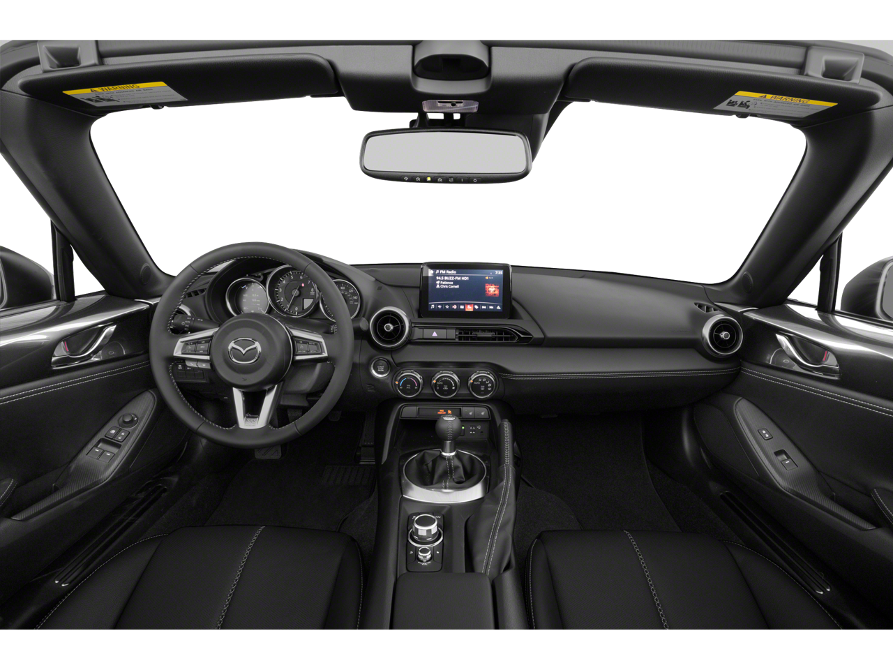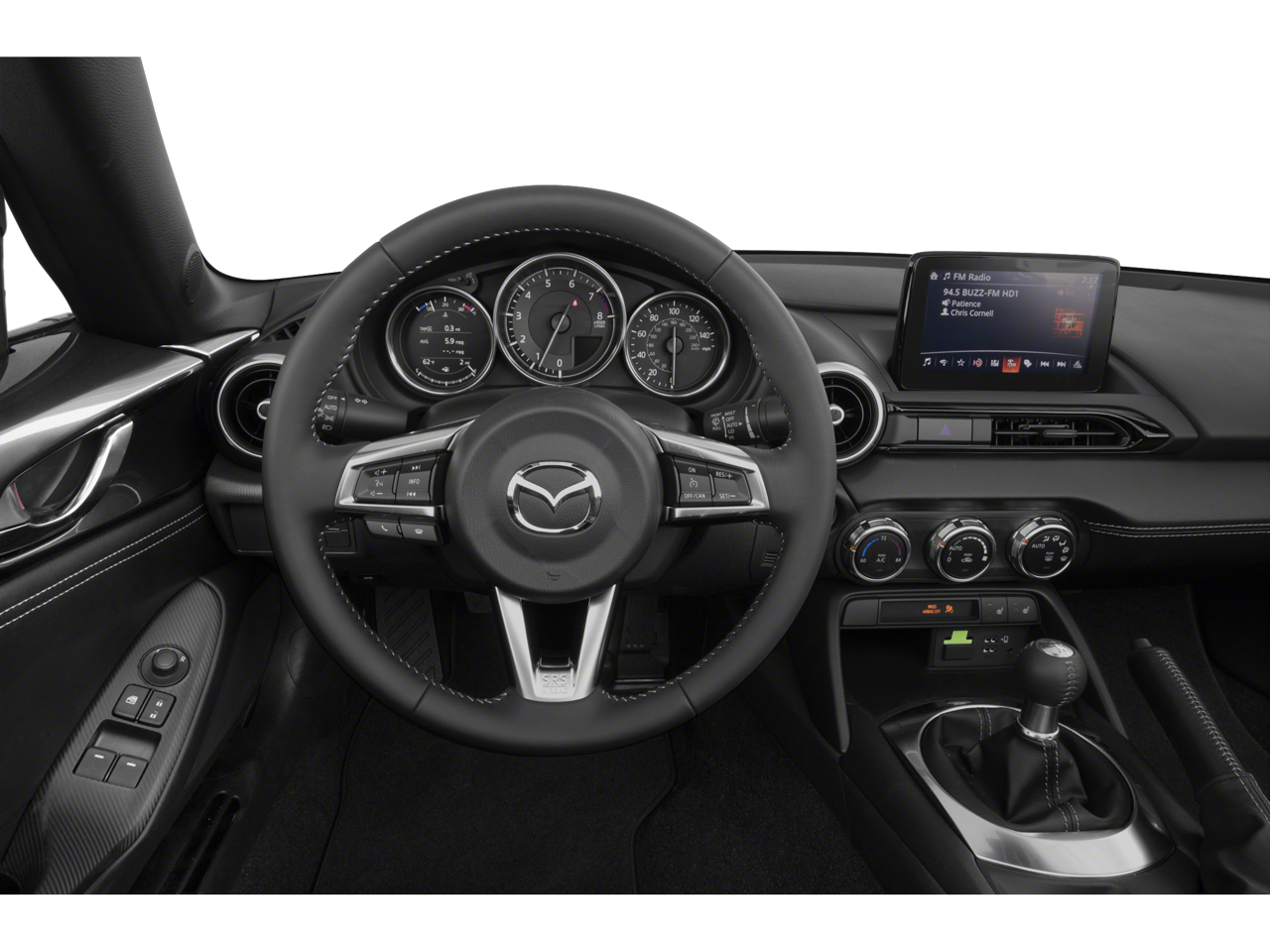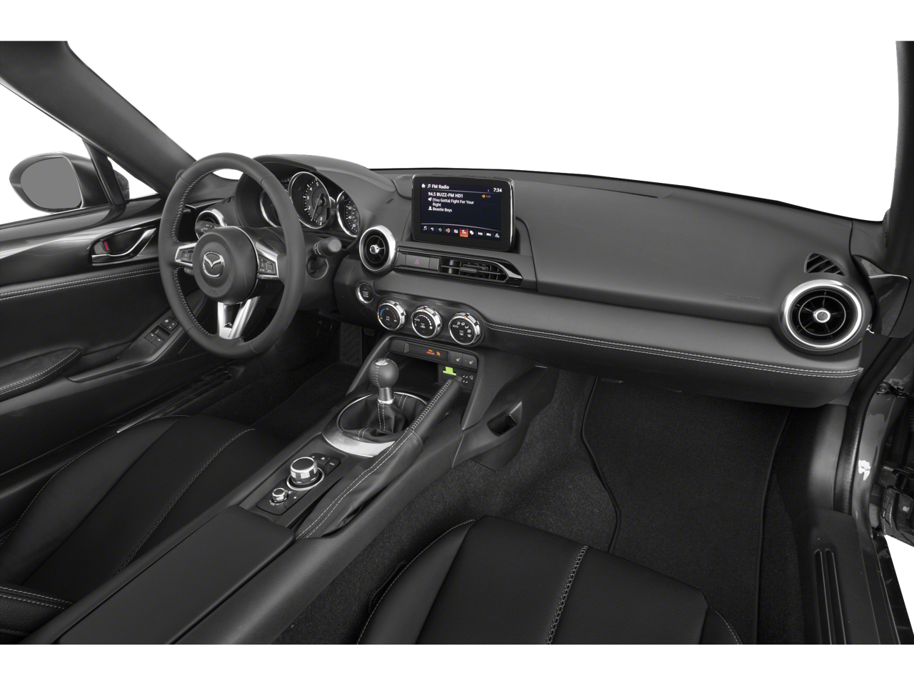 Below is all the standard equipment Appearance Package (Black Rear Bumper Skirt, Black Rear Lip Spoiler, and Black Side Sill Extensions), Navigation System, 4-Wheel Disc Brakes, 9 Speakers, ABS brakes, Air Conditioning, Alloy wheels, AM/FM radio: SiriusXM, AppLink/Apple CarPlay and Android Auto, Auto High-beam Headlights, Auto-dimming door mirrors, Auto-dimming Rear-View mirror, Automatic temperature control, Brake assist, Bumpers: body-color, Convertible roof lining, Convertible roof wind blocker, Delay-off headlights, Driver vanity mirror, Dual front impact airbags, Dual front side impact airbags, Electronic Stability Control, Emergency communication system: MAZDA CONNECT, Exterior Parking Camera Rear, Four wheel independent suspension, Front anti-roll bar, Front Bucket Seats, Front Center Armrest, Fully automatic headlights, Garage door transmitter: HomeLink, Glass rear window, Heated door mirrors, Heated Front Bucket Seats, Heated front seats, Illuminated entry, Leather Shift Knob, Leather Upholstery w/Light Gray Stitching, Low tire pressure warning, MAZDA CONNECT, Occupant sensing airbag, Outside temperature display, Panic alarm, Passenger vanity mirror, Power door mirrors, Power steering, Power windows, Radio data system, Radio: Bose Audio System w/AudioPilot, Rain sensing wipers, Rear anti-roll bar, Rear window defroster, Remote keyless entry, Speed control, Speed-sensing steering, Sport steering wheel, Steering wheel mounted audio controls, Tachometer, Telescoping steering wheel, Tilt steering wheel, Traction control, Trip computer, Variably intermittent wipers, Wheel Locks, and Wheels: 17 x 7 Dark Silver Aluminum Alloy.