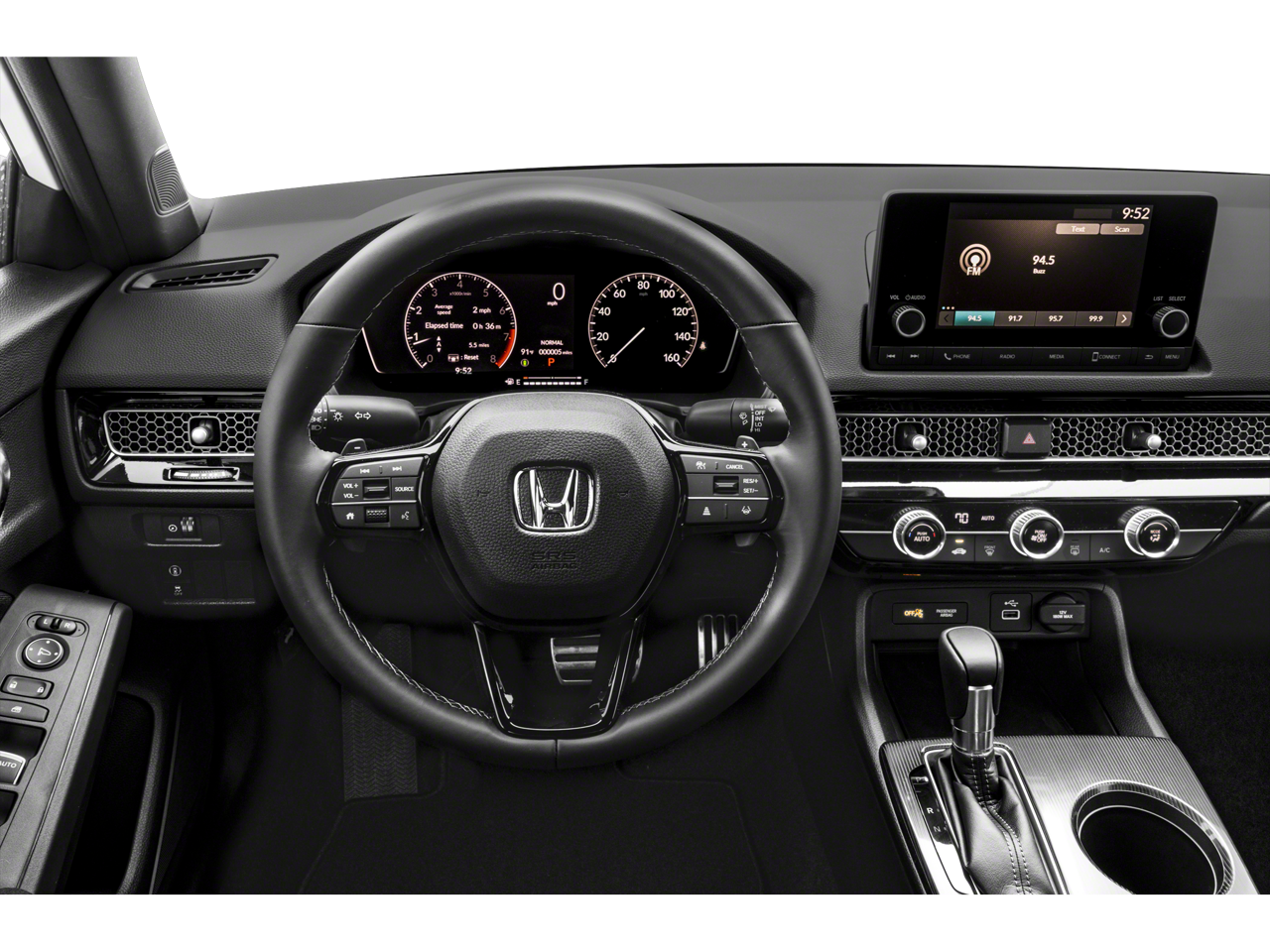 Below is all the standard equipment Cloth, 4-Wheel Disc Brakes, 8 Speakers, ABS brakes, Adaptive Cruise Control: Adaptive Cruise Control (ACC) with Low-Speed Follow, Air Conditioning, Alloy wheels, AM/FM radio, Apple CarPlay/Android Auto, Auto High-beam Headlights, Automatic temperature control, Brake assist, Bumpers: body-color, Cloth Seat Trim, Delay-off headlights, Driver door bin, Driver vanity mirror, Dual front impact airbags, Dual front side impact airbags, Electronic Stability Control, Emergency communication system: HondaLink, Exterior Parking Camera Rear, Four wheel independent suspension, Front anti-roll bar, Front Bucket Seats, Front Center Armrest, Front reading lights, Fully automatic headlights, Illuminated entry, Knee airbag, Leather Shift Knob, Leather steering wheel, Low tire pressure warning, Occupant sensing airbag, Outside temperature display, Overhead airbag, Panic alarm, Passenger door bin, Passenger vanity mirror, Power door mirrors, Power steering, Power windows, Radio data system, Radio: 180-Watt Audio System w/8 Speakers, Rear anti-roll bar, Rear side impact airbag, Rear window defroster, Remote keyless entry, Security system, Speed control, Speed-sensing steering, Steering wheel mounted audio controls, Tachometer, Telescoping steering wheel, Tilt steering wheel, Traction control, Trip computer, and Wheels: 18 Gloss Black Alloy.