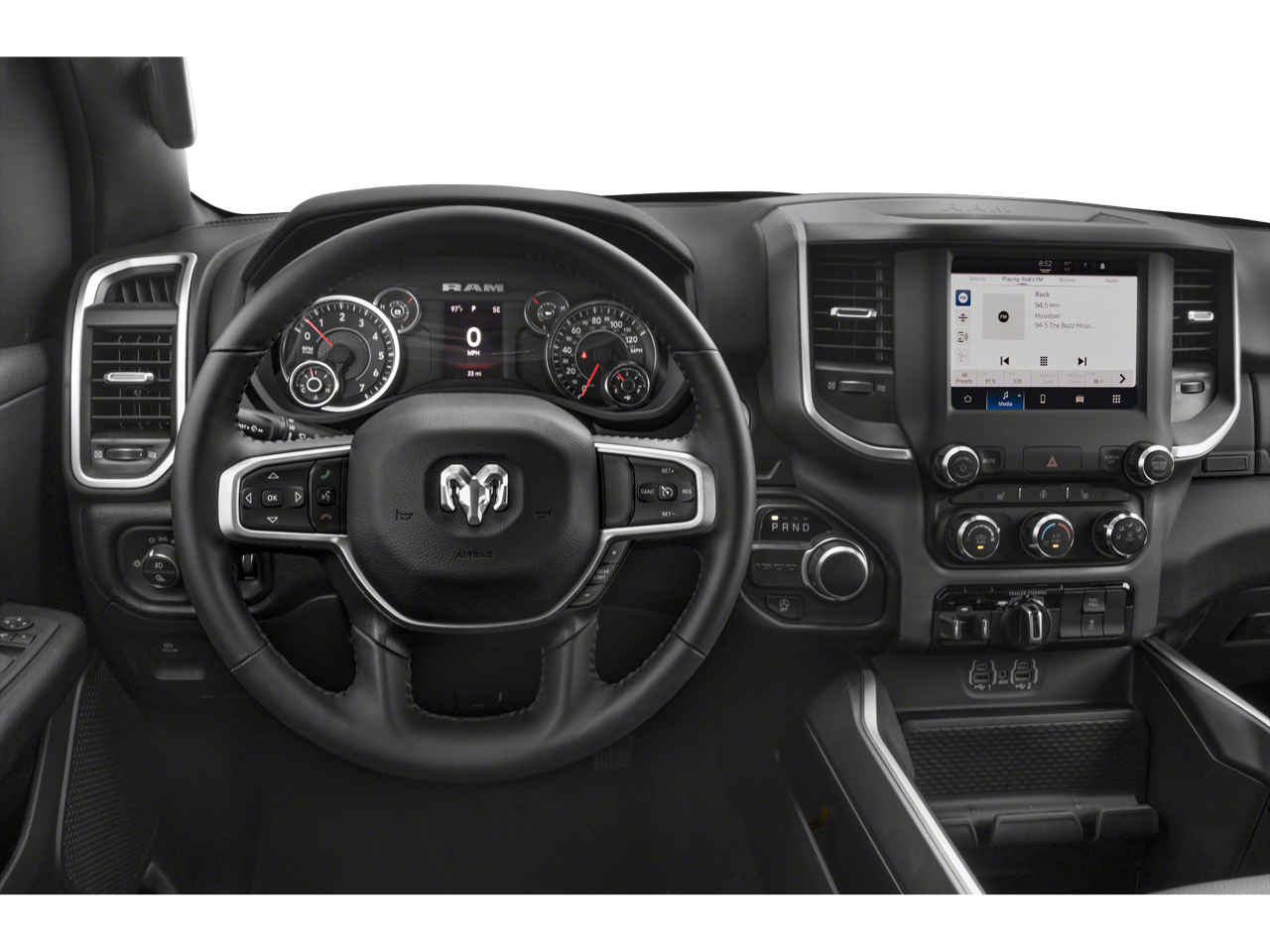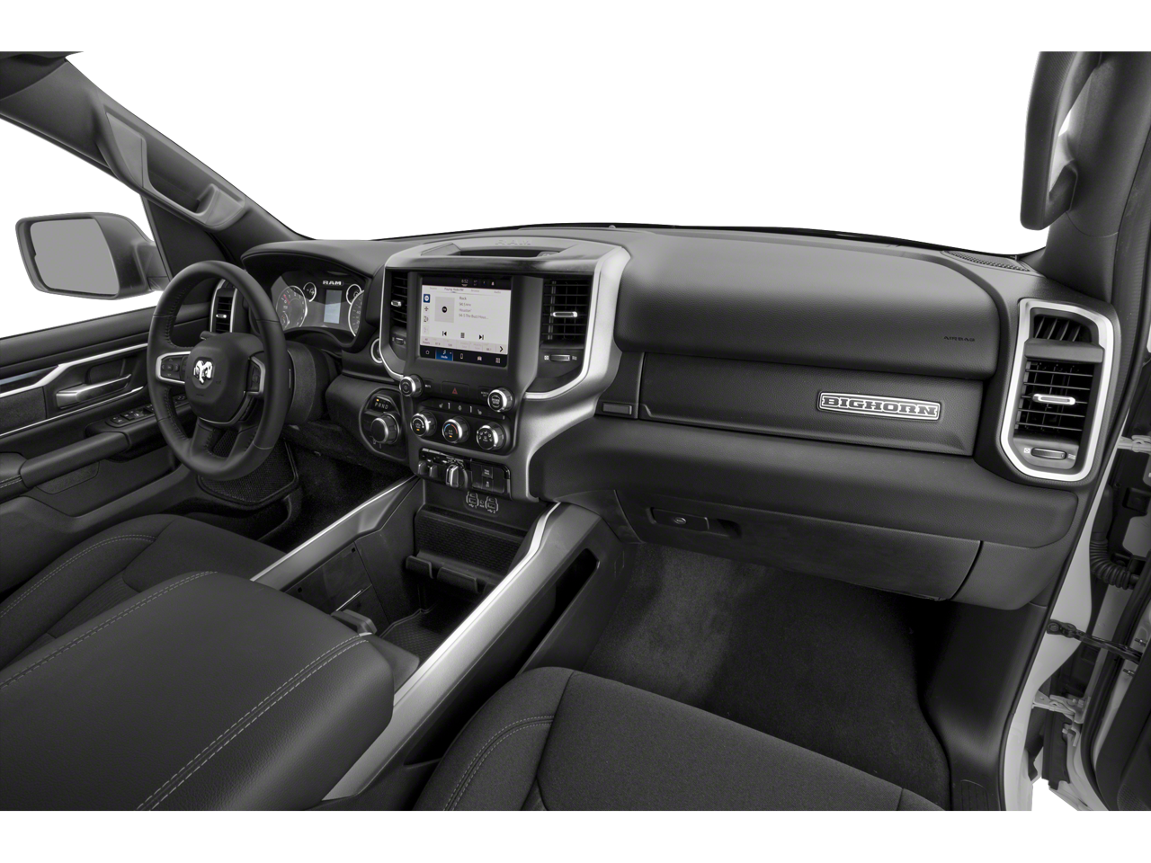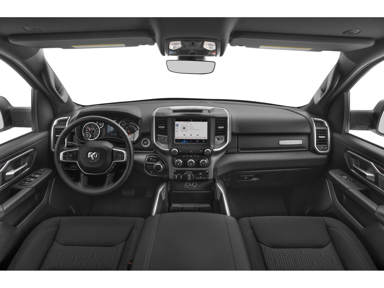 Below is all the standard equipment Big Horn Level B Equipment Group (115V Auxiliary Power Outlet, 2nd Row In Floor Storage Bins, 400W Inverter, 4G LTE Wi-Fi Hot Spot, 9 Amplified Speakers w/Subwoofer, Air Conditioning ATC w/Dual Zone Control, All R1 High Radios, All Radio Equipped Vehicles, Apple CarPlay, Auto-Dimming Exterior Driver Mirror, Auto-Dimming Rear-View Mirror, Black Premium Power Mirrors, Class IV Receiver Hitch, Cluster 7.0 TFT Color Display, Connected Travel & Traffic Services, Connectivity - US/Canada, Convex Wide-Angle Exterior Mirror Insert, Exterior Mirrors Courtesy Lamps, Exterior Mirrors w/Heating Element, Exterior Mirrors w/Supplemental Signals, For Details, Visit DriveUconnect.com, For More Info, Call 800-643-2112, Front Fog Lamps, Global Telematics Box Module (TBM), Glove Box Lamp, Google Android Auto, GPS Navigation, HD Radio, Heated Front Seats, Heated Steering Wheel, Integrated Voice Command w/Bluetooth®, LED Footwell Lighting, Media Hub w/2 Charge Only USBs, ParkSense Front/Rear Park Assist w/Stop, Power 2-Way Driver Lumbar Adjust, Power 8-Way Driver Seat, Power Adjustable Pedals, Power-Folding Mirrors, Radio: Uconnect 5 Nav w/12.0 Display, Rear Dome w/On/Off Switch Lamp, Rear Power Sliding Window, Rear Window Defroster, Remote Start System, Security Alarm, SiriusXM Radio Service, SiriusXM Satellite Radio, SiriusXM w/360L, Sun Visors w/Illuminated Vanity Mirrors, Universal Garage Door Opener, and USB Host Flip), Night Edition (3 Rear Seat Head Restraints, 4 Way Front Headrests, Accent Color Door Handles, Accent Color Premium Power Mirrors, Anti-Spin Differential Rear Axle, Black Exterior Truck Badging, Black Headlamp Bezels, Black Interior Accents, Black Painted Exterior Mirrors Caps, Body Color Front Bumper, Body Color Rear Bumper w/Step Pads, Bucket Seats, Deluxe Cloth Bucket Seats, Dual Exhaust w/Black Tips, Front Seat Back Map Pockets, Full Length Floor Console, Grille Surround 1 Black Texture 2 Black, Manual Adjust 4-Way Front Passenger Seat, RAM Grille Badge - Black, Rear 60/40 Folding Seat, Rear Center Armrest, and Wheels: 20 x 9.0 Premium Paint/Polished), Quick Order Package 23Z Big Horn (Big Horn Badge), 3.21 Rear Axle Ratio, 4-Wheel Disc Brakes, 48V Belt Starter Generator, 6 Speakers, ABS brakes, Air Conditioning, Alloy wheels, AM/FM radio, Blind Spot & Cross Path Detection, Brake assist, Bumpers: chrome, Cloth Bench Seat, Compass, Delay-off headlights, Driver door bin, Dual front impact airbags, Dual front side impact airbags, Electronic Stability Control, Emergency communication system: RAM Connect, Front anti-roll bar, Front Center Armrest w/Storage, Front reading lights, Front wheel independent suspension, Fully automatic headlights, Heated door mirrors, Illuminated entry, Leather steering wheel, LED Taillamps, Low tire pressure warning, Occupant sensing airbag, Outside temperature display, Overhead airbag, Overh