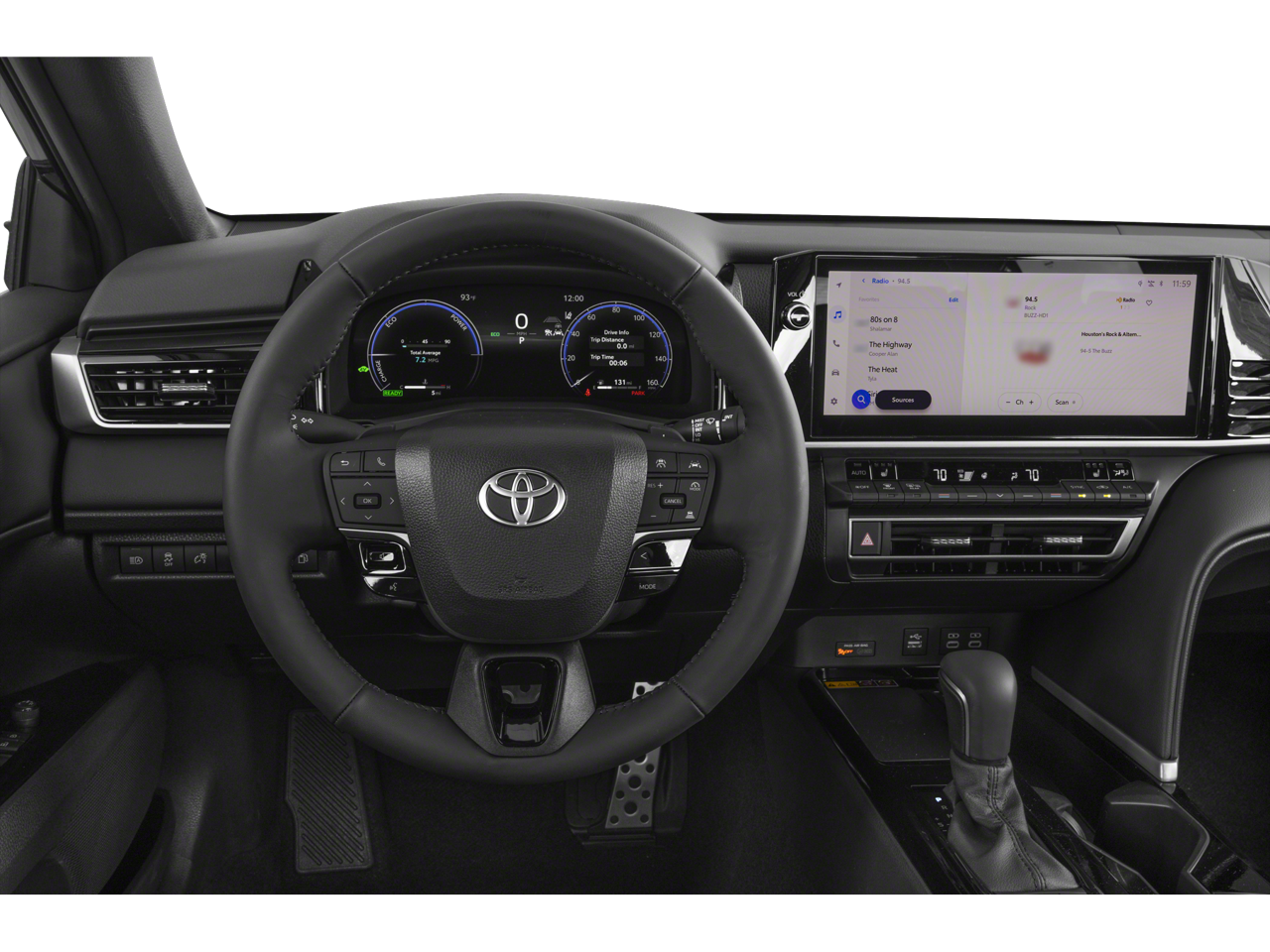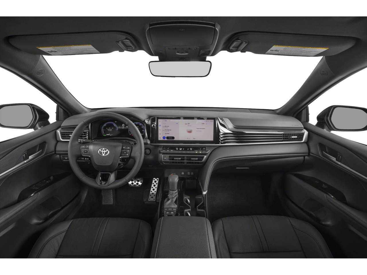 Below is all the standard equipment Black w/Leather Seat Trim, Panoramic Glass Roof, 4-Wheel Disc Brakes, 6 Speakers, ABS brakes, Air Conditioning, Alloy wheels, AM/FM radio: SiriusXM, Apple CarPlay/Android Auto, Auto High-beam Headlights, Auto-dimming Rear-View mirror, Automatic temperature control, Brake assist, Bumpers: body-color, Delay-off headlights, Driver door bin, Driver vanity mirror, Dual front impact airbags, Dual front side impact airbags, Electronic Stability Control, Emergency communication system: Safety Connect (5-year trial), Exterior Parking Camera Rear, Four wheel independent suspension, Front anti-roll bar, Front Bucket Seats, Front Center Armrest, Front dual zone A/C, Front reading lights, Fully automatic headlights, Garage door transmitter: HomeLink, Heated door mirrors, Heated Front Seats, Heated front seats, Heated steering wheel, Illuminated entry, Knee airbag, Leather Seat Trim, Leather Shift Knob, Leather steering wheel, Low tire pressure warning, Navigation system: Drive Connect (1 year trial) includes Cloud Navigation with real time traffic and Google POI, Occupant sensing airbag, Outside temperature display, Overhead airbag, Overhead console, Panic alarm, Passenger door bin, Passenger vanity mirror, Power door mirrors, Power driver seat, Power passenger seat, Power steering, Power windows, Radio data system, Radio: 12.3 Toyota Multimedia Audio, Rear anti-roll bar, Rear reading lights, Rear seat center armrest, Rear window defroster, Remote keyless entry, Security system, Speed control, Speed-sensing steering, Split folding rear seat, Spoiler, Steering wheel mounted audio controls, Telescoping steering wheel, Tilt steering wheel, Traction control, Trip computer, Turn signal indicator mirrors, Variably intermittent wipers, and Wheels: 19 Smoked Gray and Black-Finished Alloy.